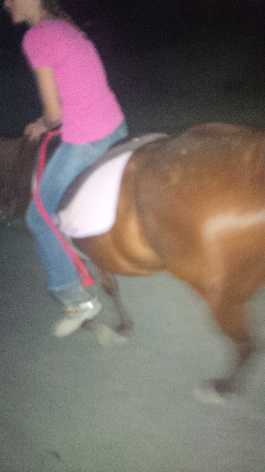It was getting dark, so we rode to T's house. Going down the middle of the road was odd as cars coming towards us blinded us with their headlights for a few paces. No street lights at all. Used my camera to take a few pictures ... The flash caught the horses by surprise at first, but they handled it quite well.